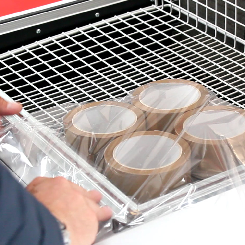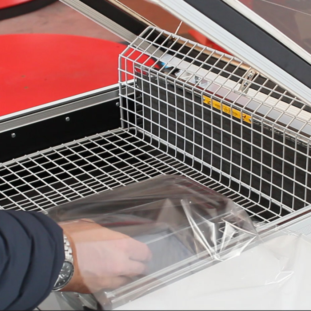 Η λειτουργία είναι απλή: ο χειριστής τοποθετεί το προϊόν μέσα στο φιλμ, το μεταφέρει στην περιοχή συγκόλλησης και κατεβάζει την καμπάνα. Η συγκόλληση και η θερμοσυρρίκνωση πραγματοποιούνται ταυτόχρονα.