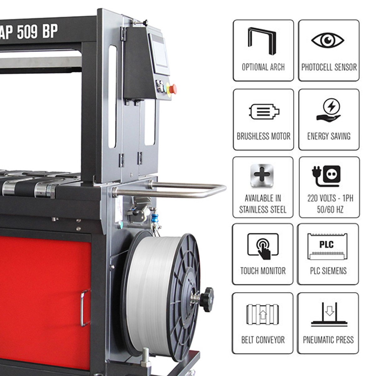 Η σειρά SPEED STRAP 505BP | 509BP | 512BP αποτελεί πλήρως αυτόματες τσερκοδετικές μηχανές υψηλών επιδόσεων, εξοπλισμένες με διπλό πνευματικό σύστημα σταθεροποίησης (pneumatic press) και πάγκο με ιμάντες μεταφοράς.