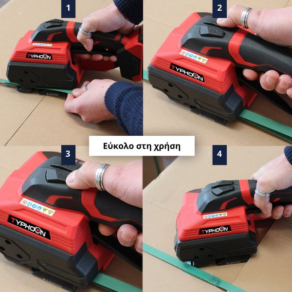 Το Typhoon είναι φορητό ηλεκτρικό εργαλείο δεσίματος με μπαταρία, ιδανικό για εφαρμογές δεσίματος με πλαστική ταινία PP/PET 13–16 mm σε βιομηχανίες, αποθήκες και κέντρα logistics. Συνδυάζει αυτόματο ήμι-αυτόματο και χειροκίνητο τρόπο λειτουργίας, επιτρέποντας να εναλλάσσεται εύκολα ο τρόπος εργασίας ανάλογα με τις ανάγκες.