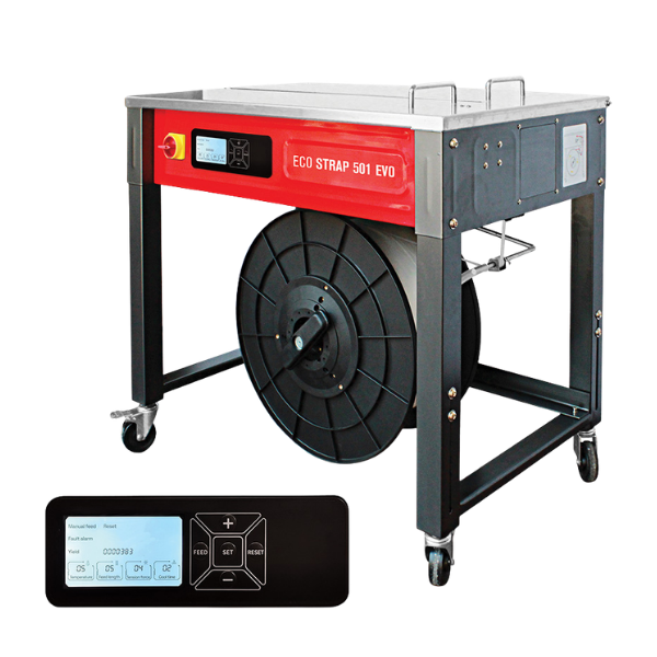 Η ECO STRAP 501 EVO είναι ημιαυτόματη επιτραπέζια μηχανή τσερκοδέματος νέας γενιάς, σχεδιασμένη για γενική χρήση σε εφαρμογές με μεσαίο έως χαμηλό όγκο εργασίας. Χρησιμοποιεί κινητήρες συνεχούς ρεύματος (DC motors) για τον έλεγχο όλων των λειτουργιών και διαθέτει σύγχρονο ψηφιακό πίνακα ελέγχου για εύκολη ρύθμιση των παραμέτρων δεσίματος.