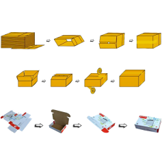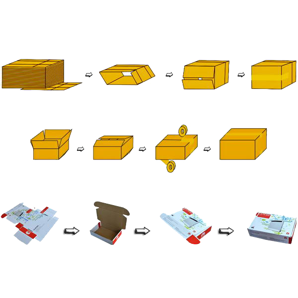 Και τα δύο μοντέλα εκτελούν την ίδια λειτουργία αφαίρεσης των καλουπιών από μια κεκλιμένη, μεγάλης χωρητικότητας αποθηκευτικό χώρο, χρησιμοποιώντας έναν περιστρεφόμενο βραχίονα με βεντούζες, για να ανοίξει και να σχηματίσει το χαρτοκιβώτιο μέσω μιας σχετικής ηλεκτρομηχανικής μονάδας και στη συνέχεια να το μεταφέρει στην περιοχή πλήρωσης. Μόλις γεμίσει, το χαρτοκιβώτιο μπορεί να κλείσει χρησιμοποιώντας κολλητική ταινία ή ζεστή κόλλα.