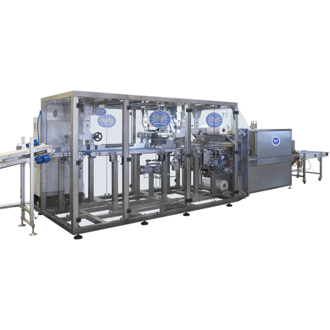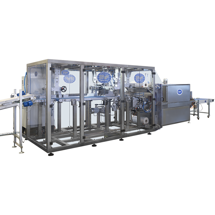 Μηχανή συσκευασίας συνεχούς κίνησης σχεδιασμένη για τη συσκευασία σακουλών οποιουδήποτε σχήματος που φτάνουν οριζόντια στον ιμάντα τροφοδοσίας, χρησιμοποιώντας θερμοσυστελλόμενη μεμβράνη.