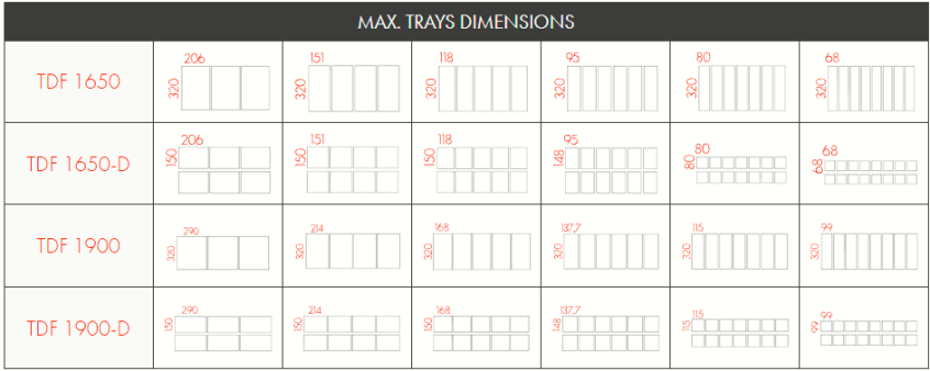 Ολοκαίνουργιο και επαναστατικό πλήρως αυτόματο mod Traysealer. TDF1650 & TDF1900: για τη συσκευασία πλαστικών, χαρτονιού και προσχηματισμένων δίσκων από αλουμίνιο, με καπάκια από πλαστικές μεμβράνες σε καρούλι, καπάκια χαρτοκιβωτίου και δυνατότητα εφαρμογής επανακλεισίματος. Πλαίσιο μηχανής πλήρως κατασκευασμένο από ανοξείδωτο χάλυβα: μεταλλικά φύλλα που λαμβάνονται με κοπή με λέιζερ, ηλεκτρικά συγκολλημένα στοιχεία συγκράτησης.