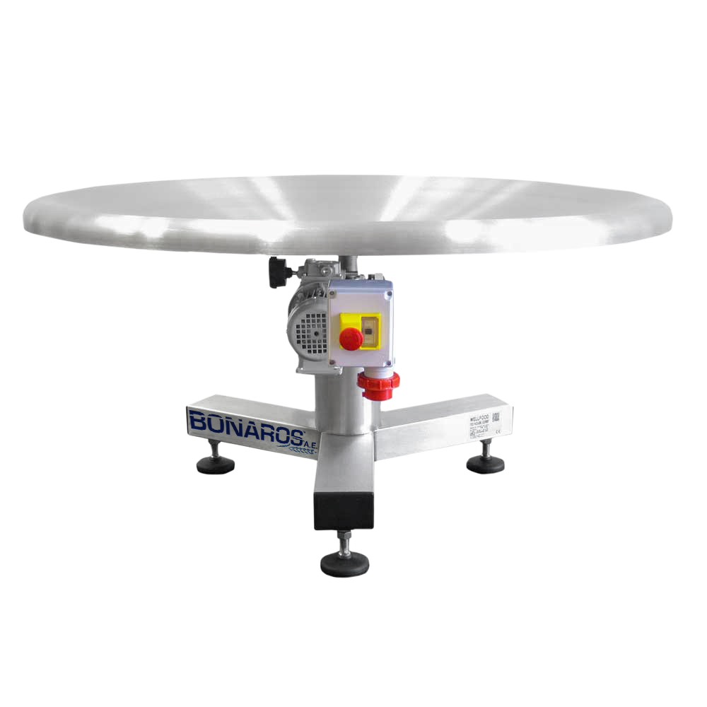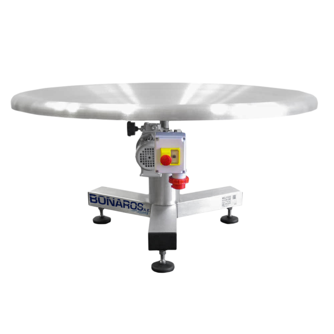 Το περιστροφικό τραπέζι λαμβάνει έτοιμα προϊόντα από τον ιμάντα εξόδου και τα έχει σε αναμονή για την επόμενη λειτουργία .